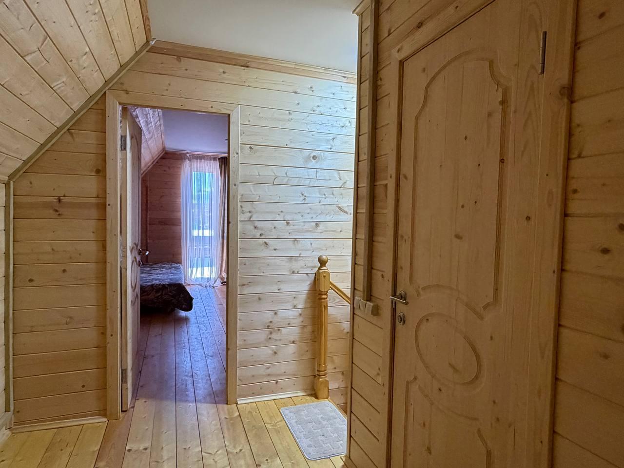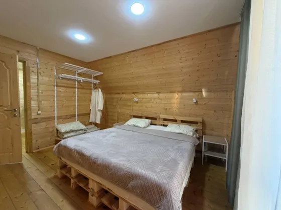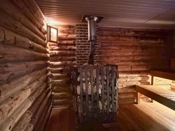 - Баня-гостевой дом (бревно, 2 этажа): Готова к постоянному проживанию, всё функционирует. Первый этаж: парная, кухня-гостиная, санузел. Второй этаж: 2 спальные комнаты, санузел