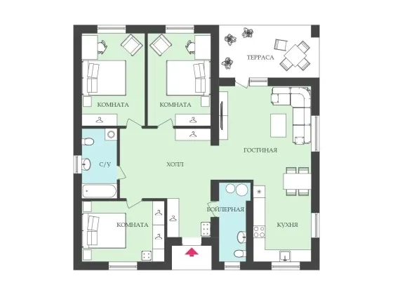- Кухня‑гостиная с выходом на веранду,