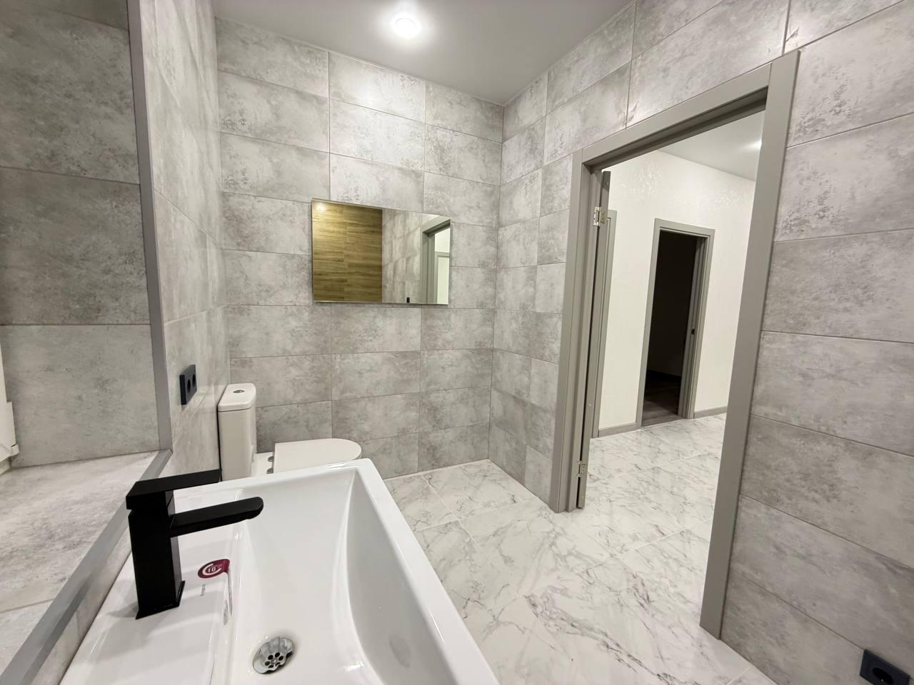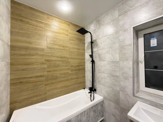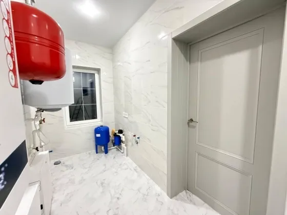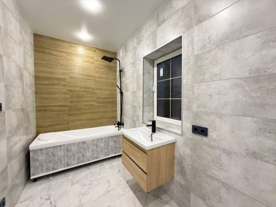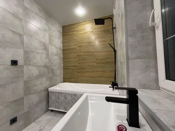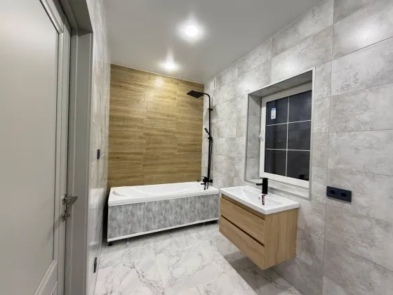 Огромное количество окон премиум-качества (70-й профиль). Окно в пол в санузле — это необычно, дорого и визуально расширяет пространство. Внутри просторно, светло, как в дорогом отеле.
