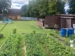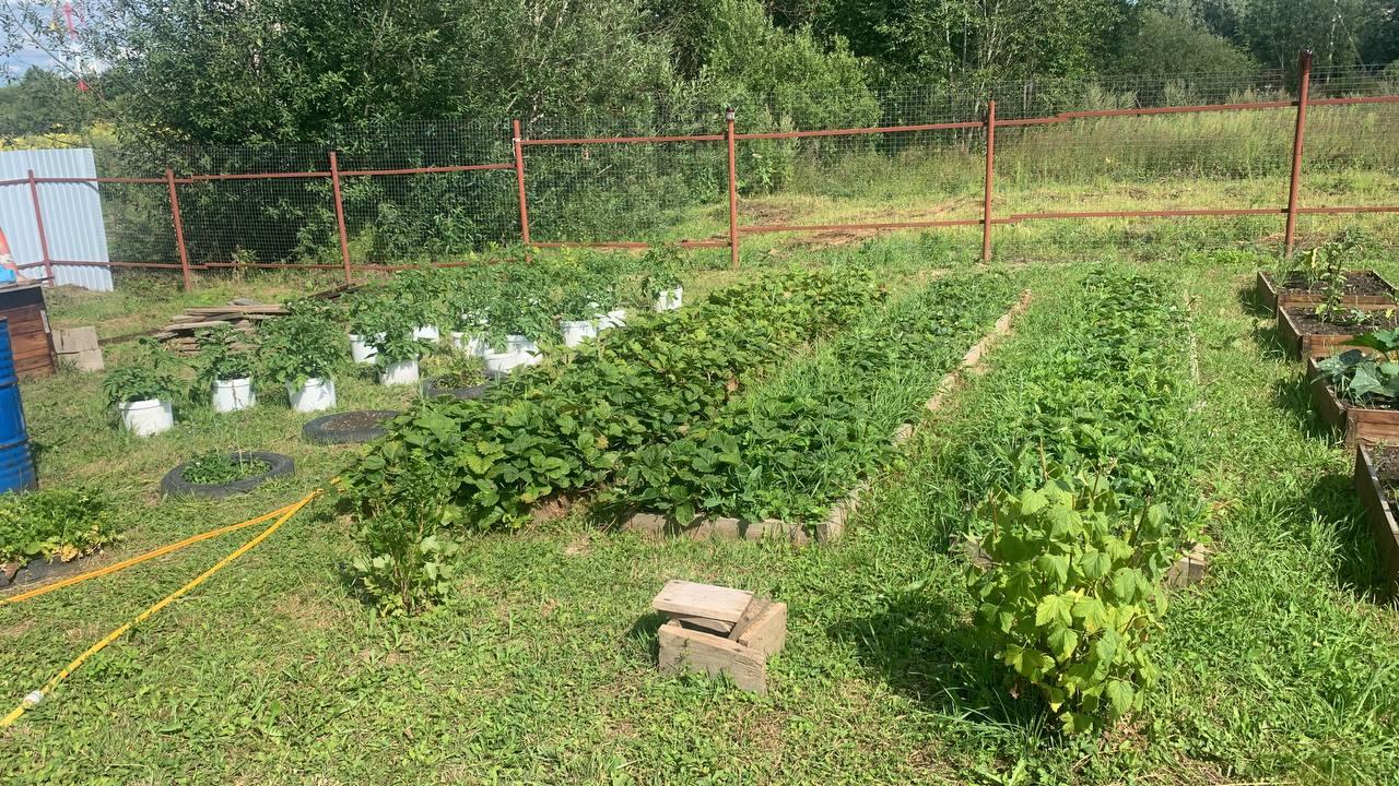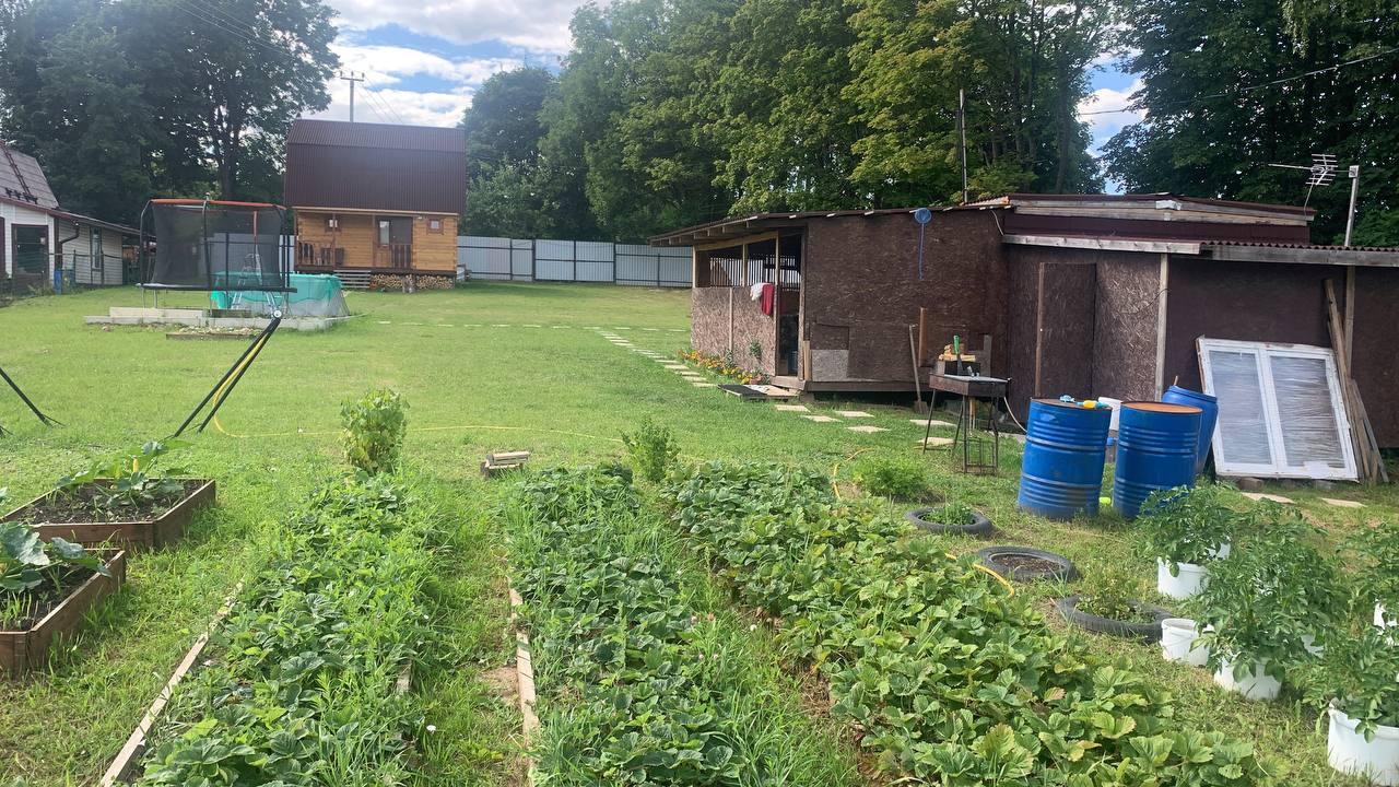 Огорожен забором 50% профлист и 50% рабичка. На участке растут малина, ежемалина, ежевика, клубника, крыжовник, чёрная смородина, яблони (2 шт.), груша, слива.